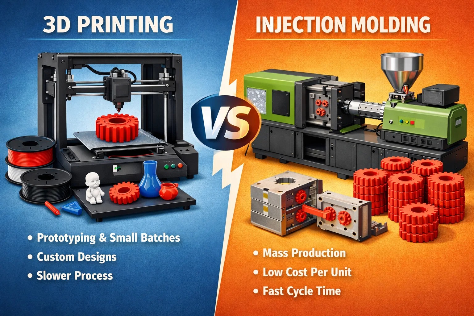 A maioria das pessoas pensa que é uma simples escolha entre a “nova escola” (impressão 3D) e a “velha escola” (moldagem por injeção). Mas honestamente? Raramente é mais tão preto e branco.