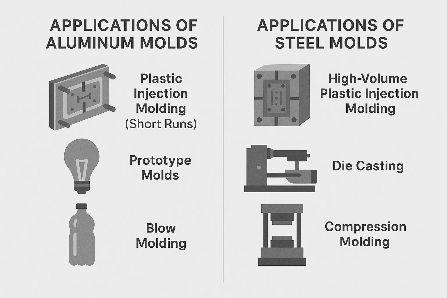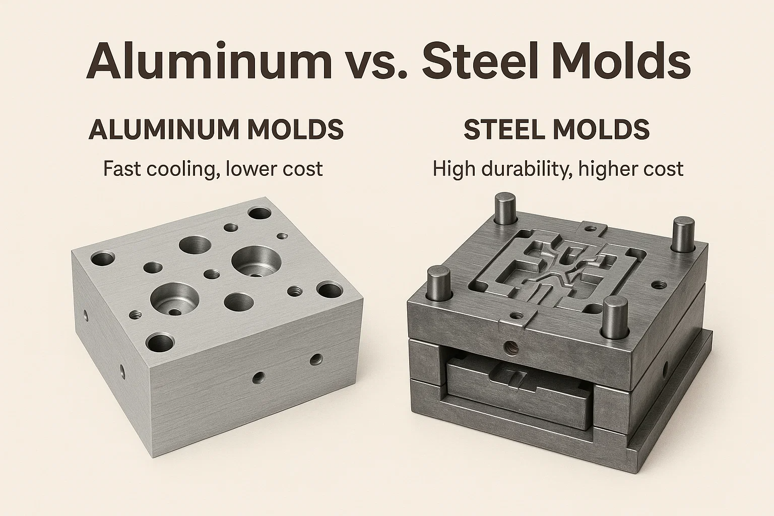 Na fabricação, Assim, o molde certo é crucial para criar peças de alta qualidade. O material que você escolhe para esse molde afeta diretamente tudo, desde a velocidade de custo e produção até a qualidade do produto final. Enquanto muitos materiais estão disponíveis, dois se destacam como os mais comuns e versáteis: alumínio e aço .