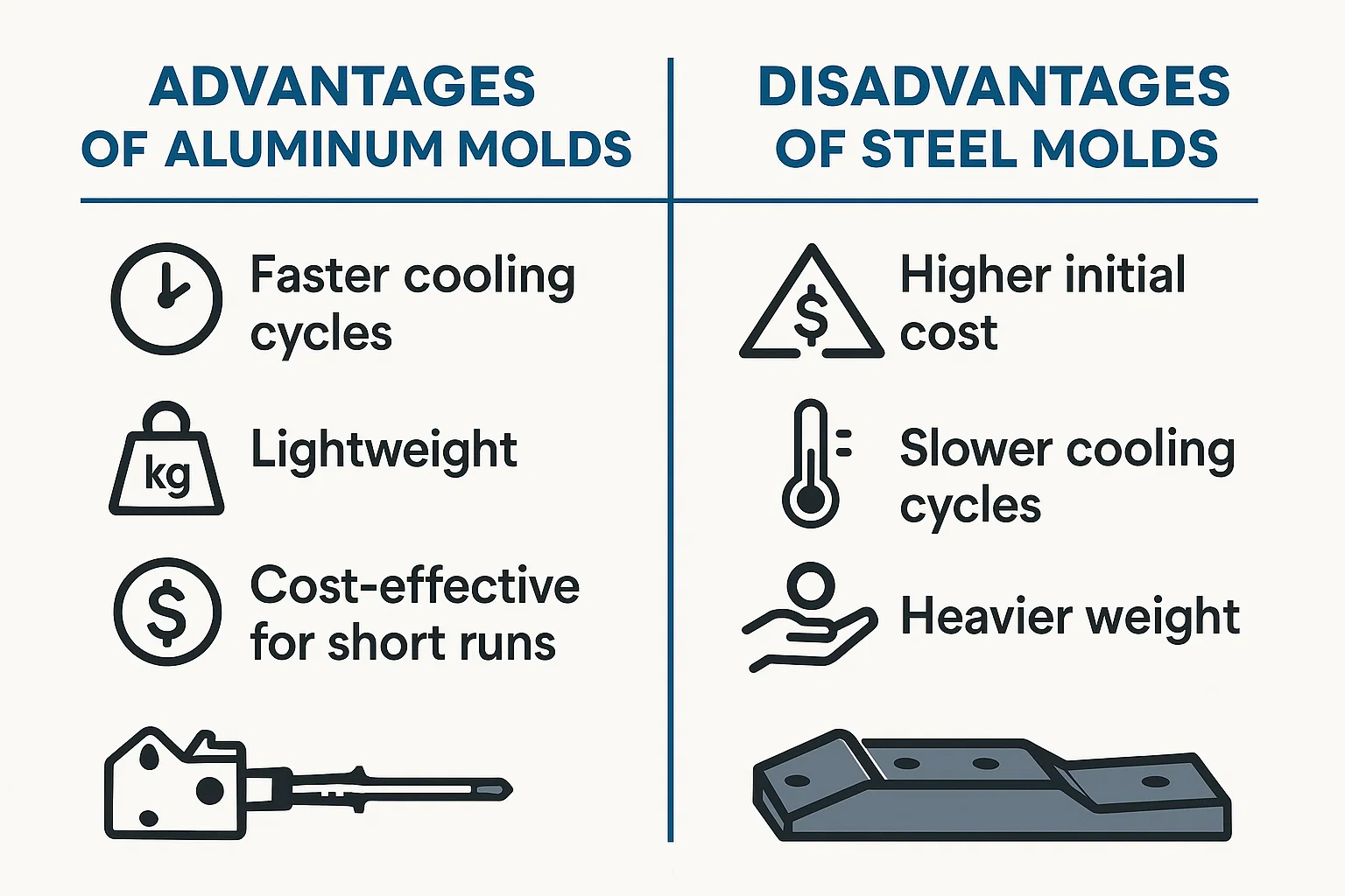 Ciclos de resfriamento mais lentos: A condutividade térmica inferior do aço significa que retém calor por mais tempo. Isso estende o tempo de resfriamento para cada parte, levando a Ciclos de produção mais lentos e saída reduzida em comparação com um molde de alumínio.