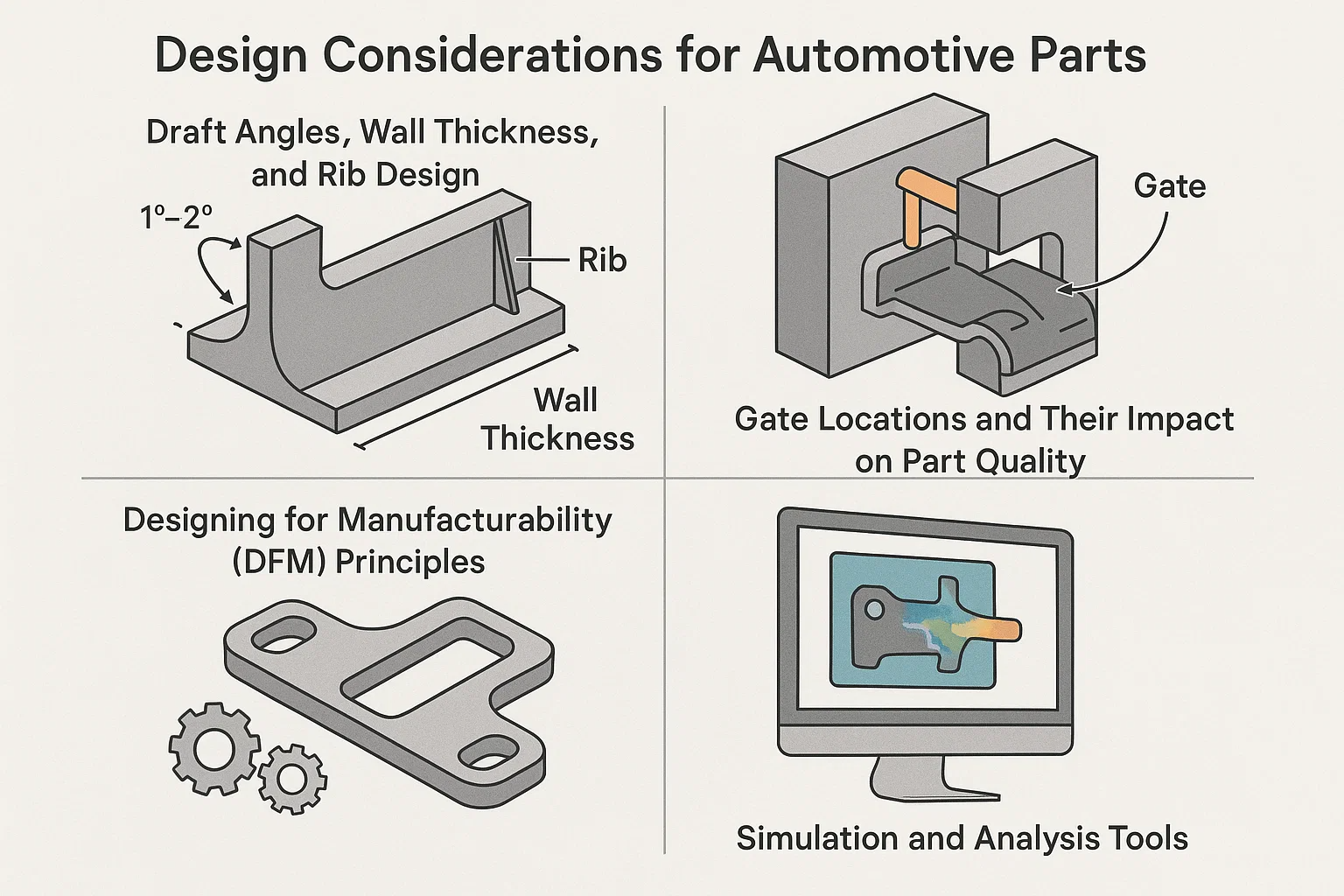 O sucesso das peças automotivas moldadas e supermoldadas por injeção depende de um processo de design meticuloso. Uma parte bem projetada não é apenas funcional, mas também manufaturável, durável e econômica. A adesão aos princípios fundamentais de design é crucial para evitar problemas comuns, como deformação, títulos fracos e defeitos cosméticos.