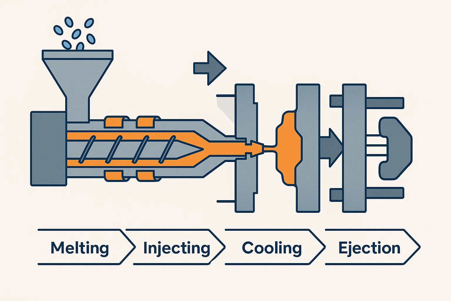 O processo de moldagem por injeção segue uma sequência precisa e cíclica: