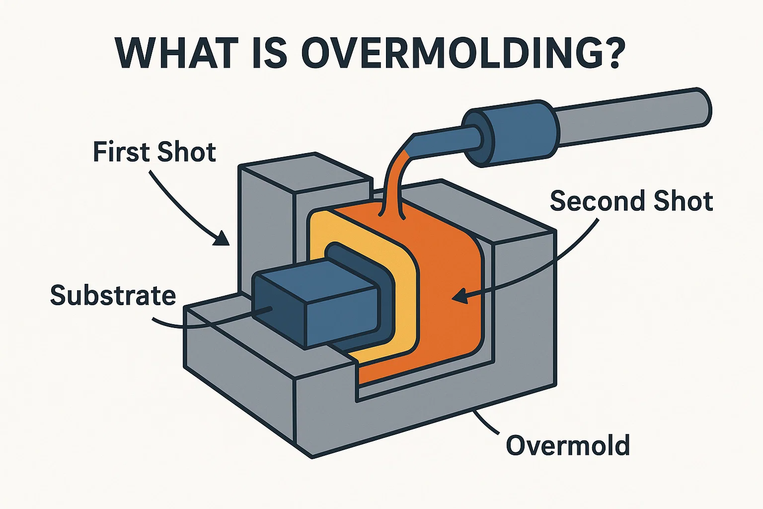 Overmolding é um processo seqüencial de duas etapas, onde o segundo material é moldado em uma parte sólida e pré-existente. Isso é ideal para adicionar uma camada macia a uma base rígida.