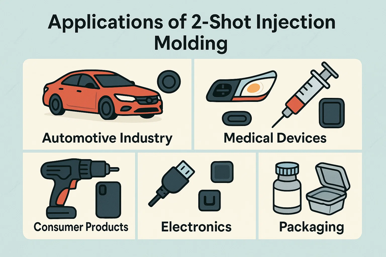 A combinação única de funcionalidade, estética e eficiência oferecida pela moldagem por injeção de 2 tiros o torna um método de fabricação preferido em um amplo espectro de indústrias. Sua capacidade de criar uma parte multimaterial única em um ciclo resolveu desafios complexos de design e montagem, levando a uma qualidade e desempenho aprimorados do produto nos setores a seguir.