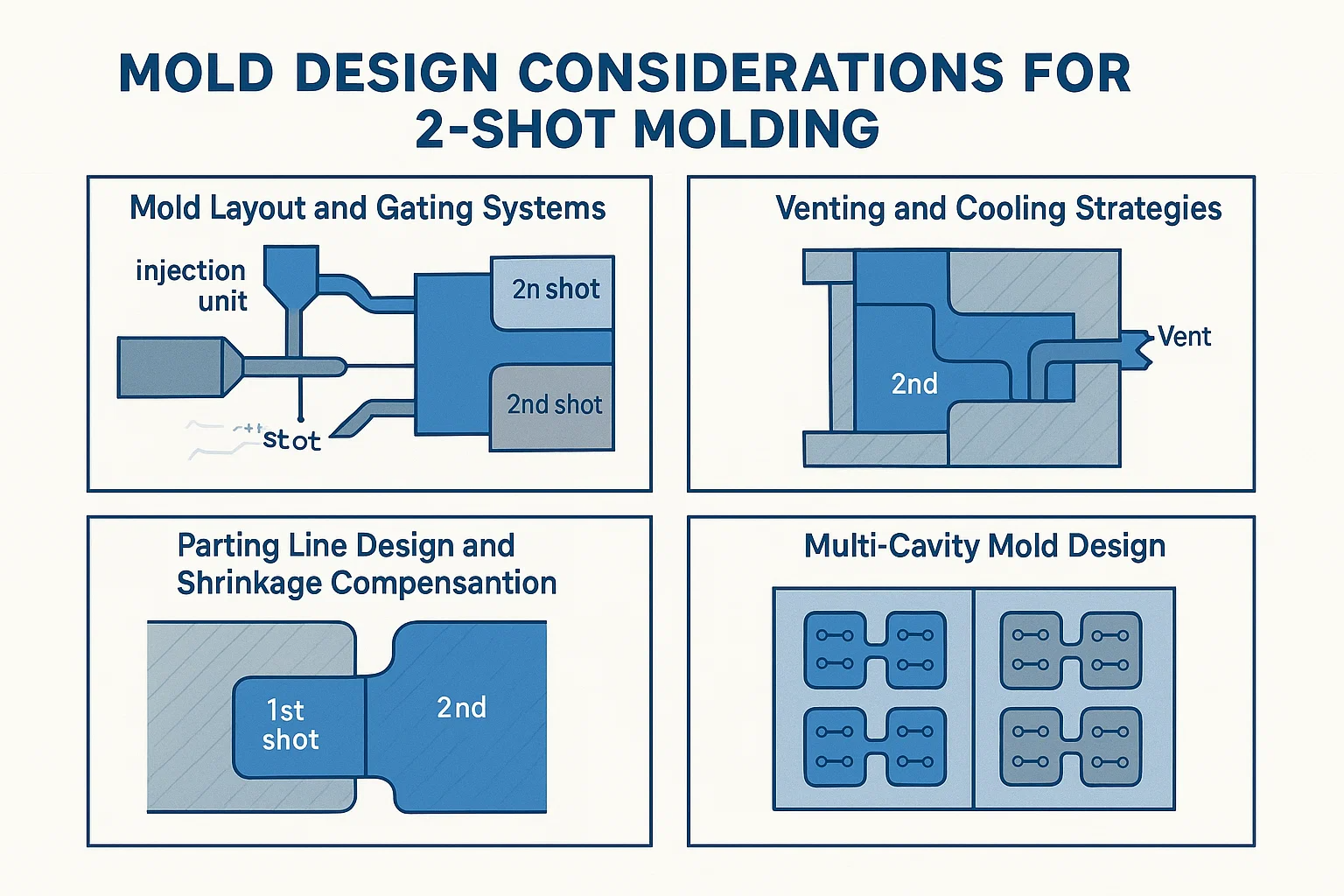 Eficaz ventilação é crucial em toda a moldagem por injeção, mas torna-se ainda mais crítico na moldagem de 2 tiros. Como o segundo material é injetado em torno da parte do primeiro tiro, o ar pode facilmente ficar preso em bolsos pequenos, levando a defeitos como marcas de queimadura, tiros curtos ou títulos incompletos. O design do molde deve incluir aberturas estrategicamente colocadas para permitir que esse ar escape.