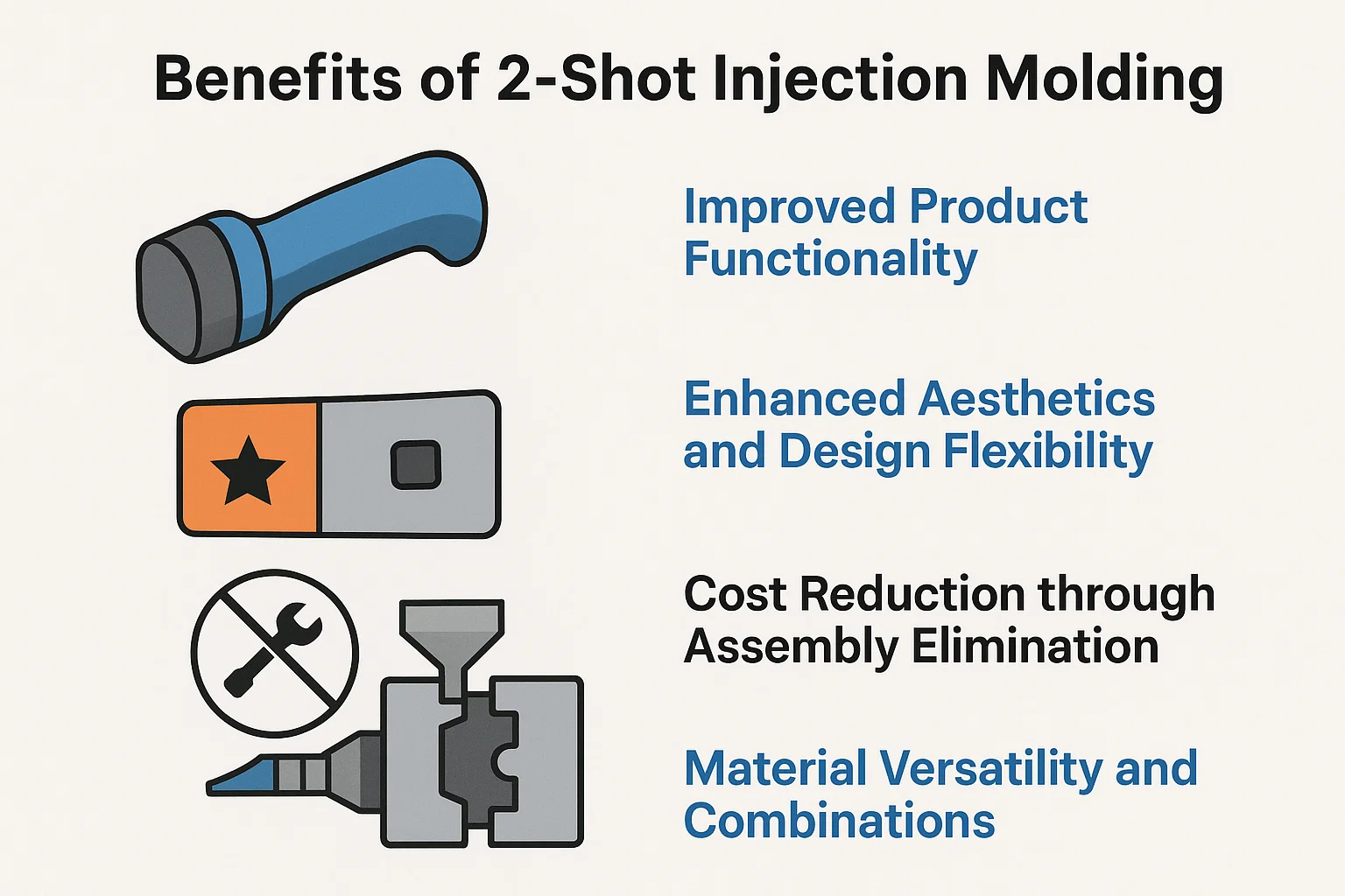 Como qualquer técnica avançada de fabricação, a moldagem por injeção de 2 tiros oferece um conjunto exclusivo de benefícios e desvantagens. Uma compreensão clara dessas trade-offs é essencial para determinar se o processo é o ajuste certo para um produto específico.