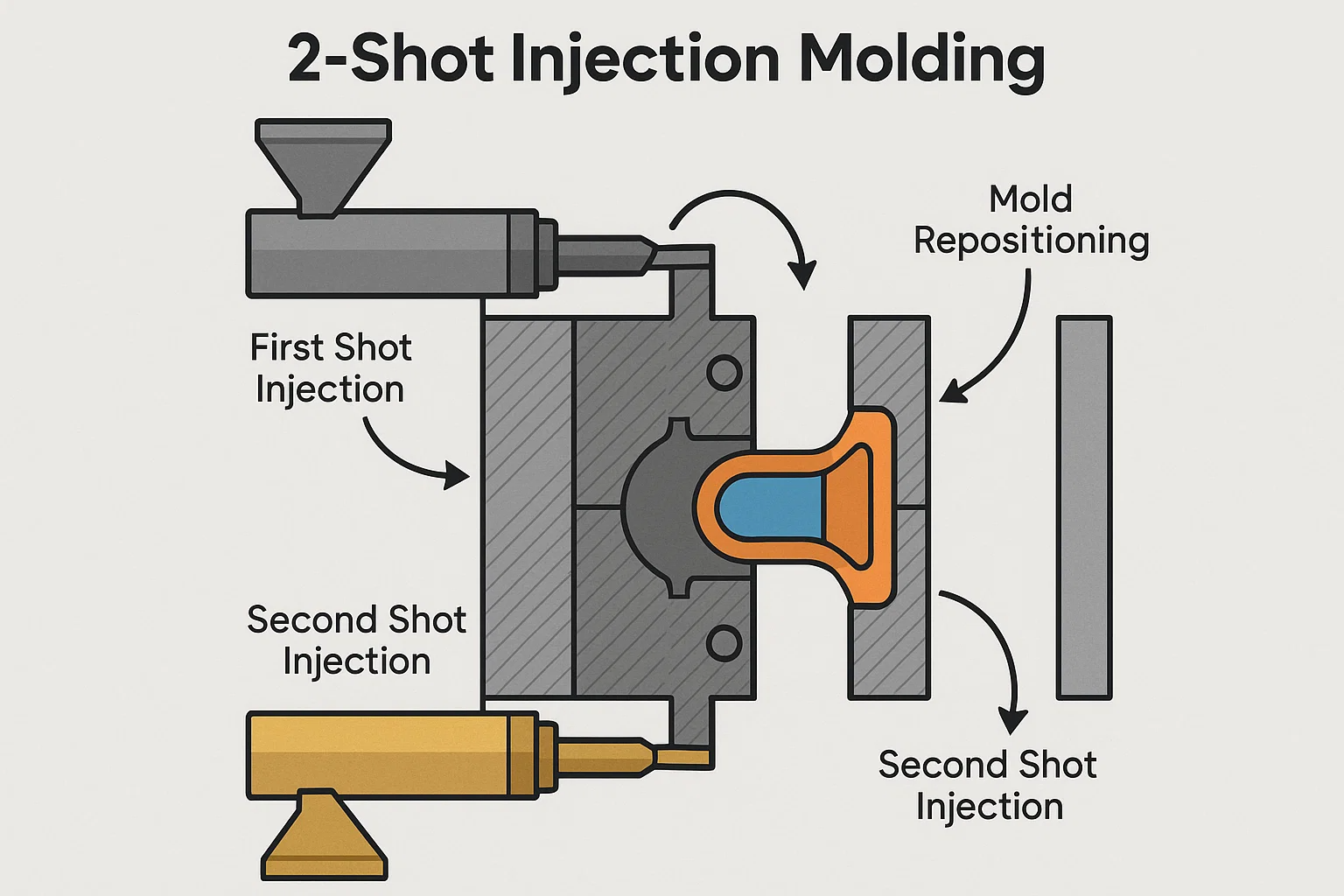 Overmolding: Esta é uma técnica específica em que um segundo material é injetado em uma parte pré-existente (o "substrato"). Enquanto a moldagem de 2 tiros é um tipo de sobremolência, o termo também pode descrever processos em que a parte do substrato foi feita separadamente e, em seguida, é colocada manual ou roboticamente em um segundo molde para a etapa de sobremolamento. A principal diferença é que, em um verdadeiro processo de 2 tiros, ambos os materiais são moldados sequencialmente dentro do mesmo ciclo da máquina, sem que a parte nunca saia da máquina.
