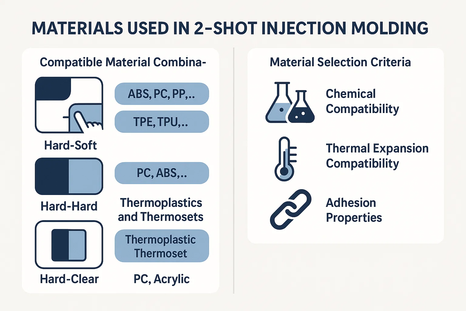 O sucesso de qualquer projeto de moldagem por injeção de 2 tiros depende da cuidadosa seleção de materiais. Os dois polímeros devem não apenas atender aos requisitos funcionais e estéticos do produto final, mas também ser compatíveis entre si para formar um vínculo forte e duradouro. Esta seção explora os tipos de combinações de materiais e os critérios críticos para selecioná -los.