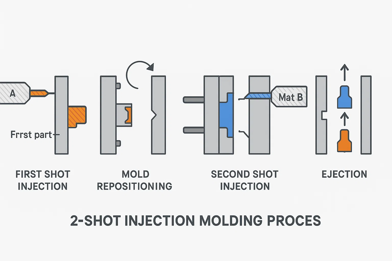 O princípio fundamental da moldagem por injeção de 2 tiros é a injeção seqüencial de dois materiais em um molde especialmente projetado. O processo geralmente segue estas etapas -chave: