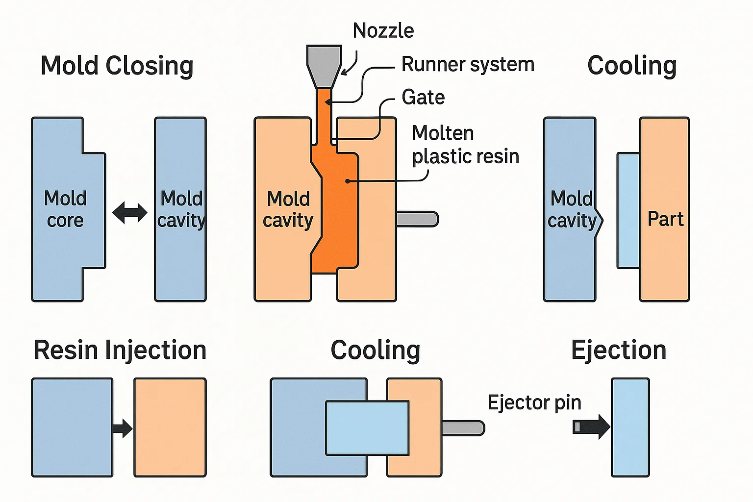 Fechamento do molde: O processo começa com o núcleo do molde e a cavidade do molde se movendo um para o outro até que eles apertem. Esta ação cria o vazio interno selado - a forma da parte final. A precisão desse alinhamento é crítica, pois qualquer desalinhamento pode causar um "clarão" (O excesso de material que está saindo ao longo da linha de despedida).