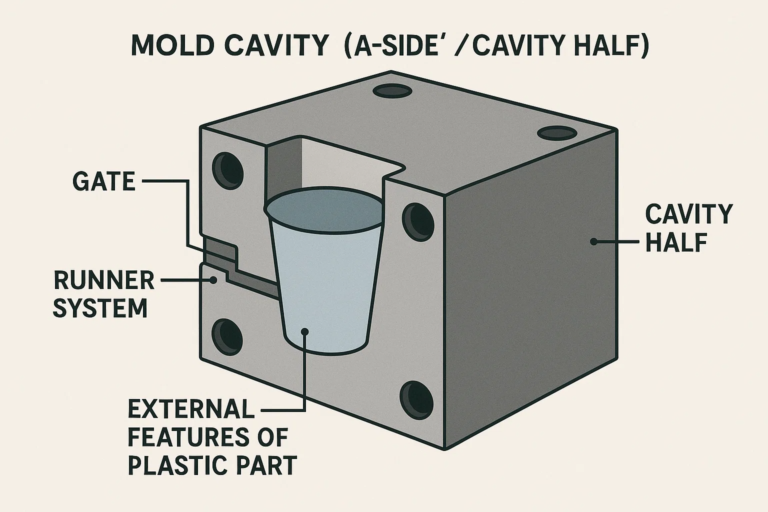 O cavidade do molde , também conhecido como "A-side" ou "Cavity Half", é o componente que forma o Recursos externos da parte plástica. É a concha ou recipiente externo que o plástico fundido preenche. Usando a analogia de copo de plástico, a cavidade formaria a parte externa do copo, incluindo as paredes lábios e externas.
