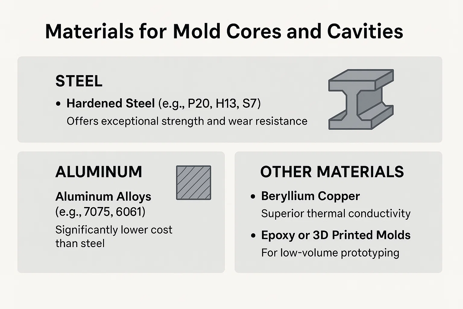 O material escolhido para o núcleo e a cavidade do molde é crítico, pois afeta diretamente a durabilidade, o custo e a capacidade do molde de produzir peças de alta qualidade com eficiência. A seleção depende de fatores como o tipo de plástico que está sendo moldado, o volume de produção necessário e a complexidade do design da peça.