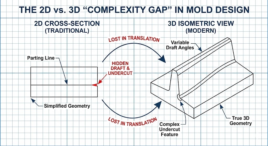 - Incompatibilidade geométrica: Os projetos 2D muitas vezes não possuem dados para ângulos de inclinação variáveis, que são essenciais para a ejeção limpa de peças plásticas complexas.