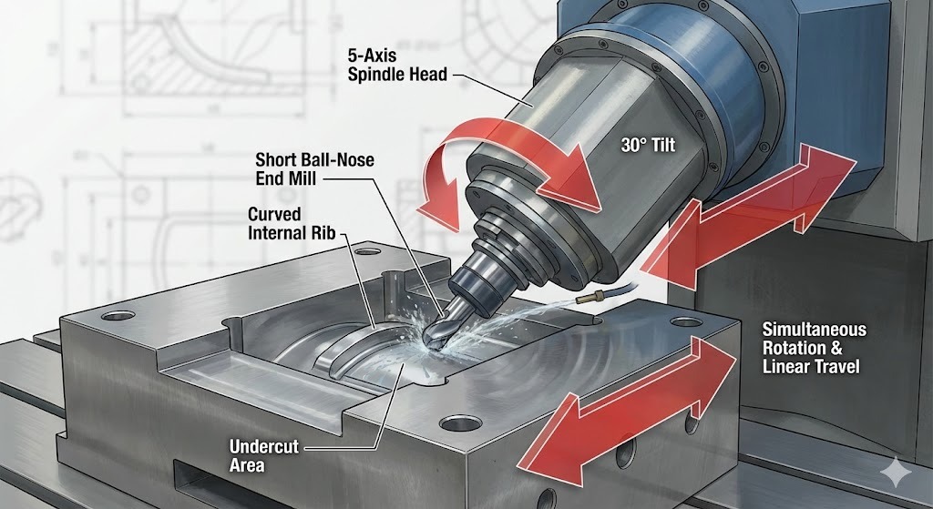- Solução de 5 eixos: A máquina inclina a cabeça ou a mesa, permitindo uma ferramenta curta e rígida para alcançar áreas profundas em um ângulo.