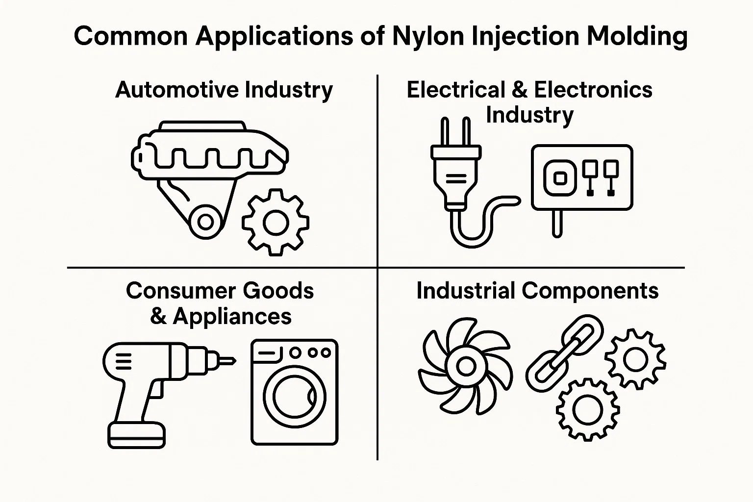 O setor automotivo é um dos maiores consumidores de náilon moldado por injeção, especialmente tipos reforçados (PA6 e PA66 com enchimento de vidro), onde o desempenho em ambientes de alto calor é essencial.