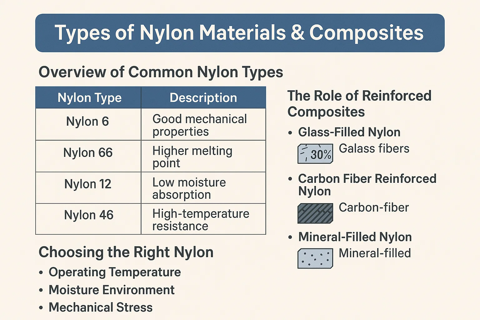 Nylon com enchimento de vidro: O composto mais comum envolve a adição fibras de vidro (por exemplo, Nylon 6 GF30, significando Nylon 6 com 30% de fibra de vidro). Isto aumenta drasticamente a resistência do material resistência à tração, rigidez (módulo) e temperatura de deflexão térmica . No entanto, também aumenta o encolhimento do material, o que pode levar a maiores empenamento e requer um projeto de molde cuidadoso.