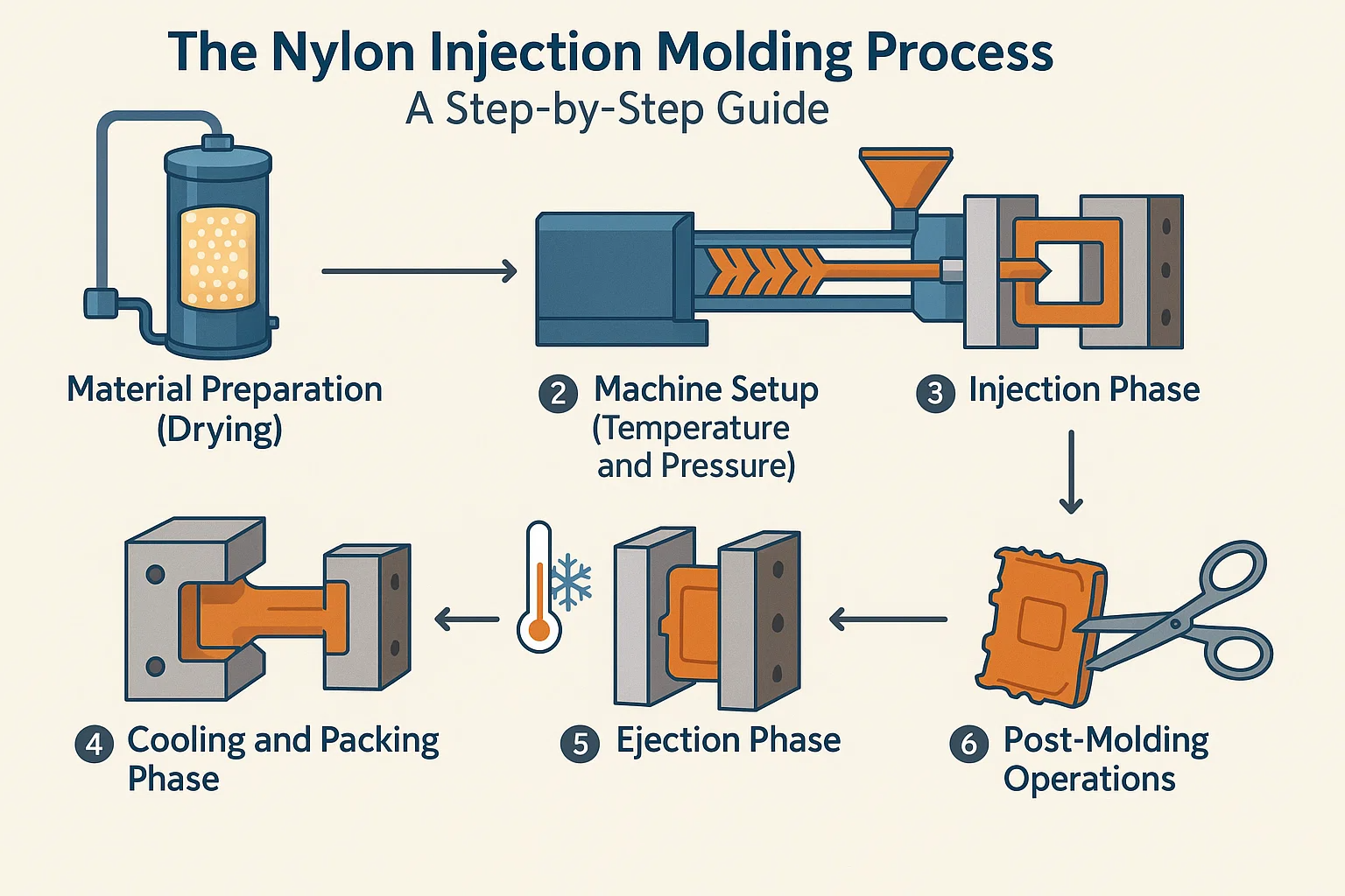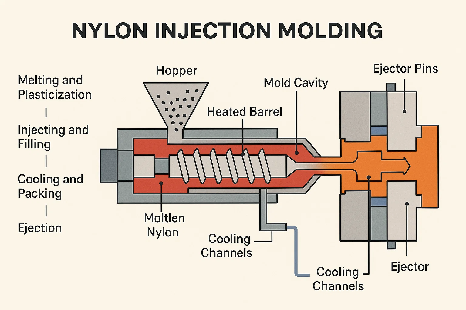 O processo é fundamentalmente semelhante à moldagem por injeção de outros plásticos, mas requer atenção específica à temperatura, controle de umidade e pressão de injeção devido às características únicas do material do náilon (especificamente seu alto ponto de fusão e natureza higroscópica).