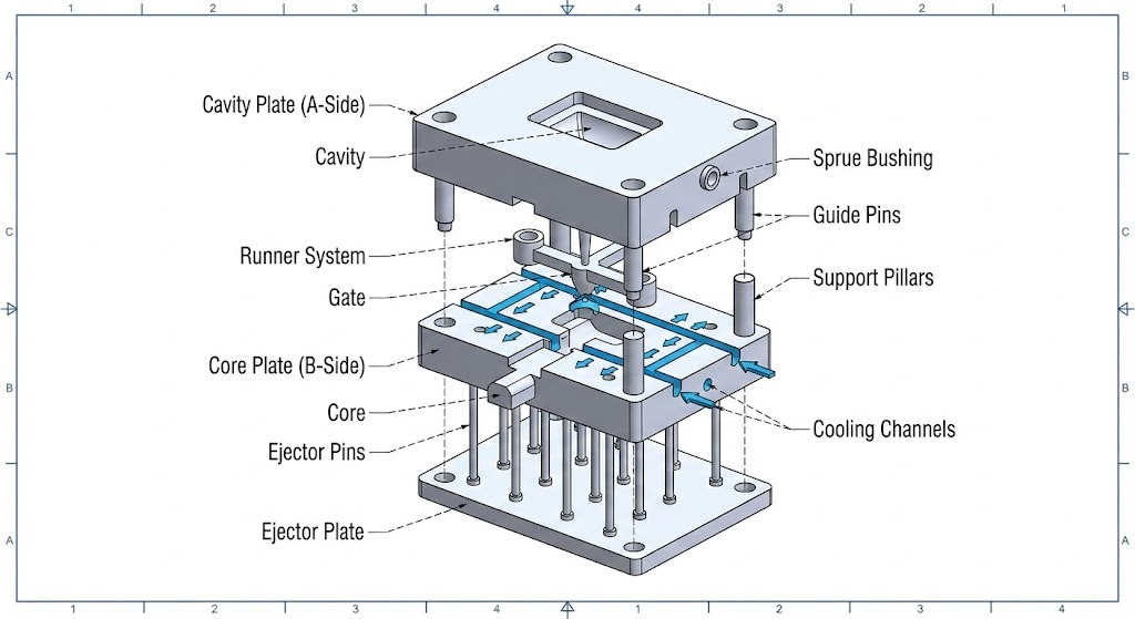 - A cavidade e o núcleo: Os lados primários “A” e “B” que formam o formato da peça plástica.
